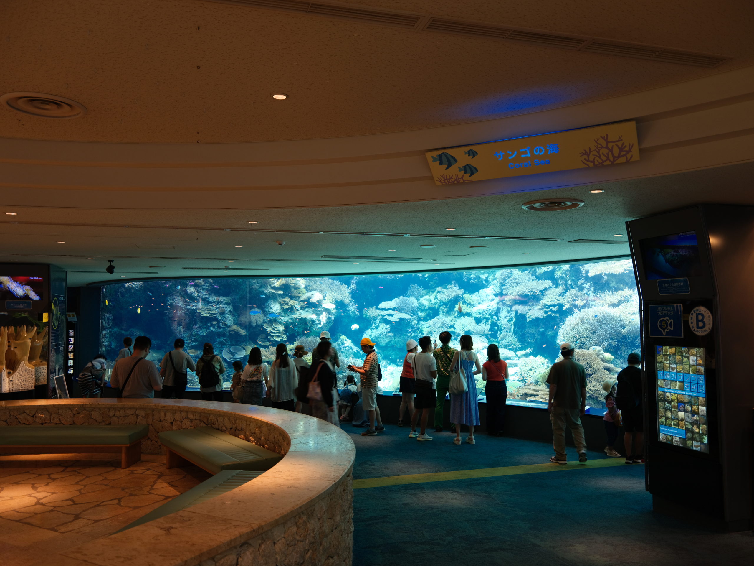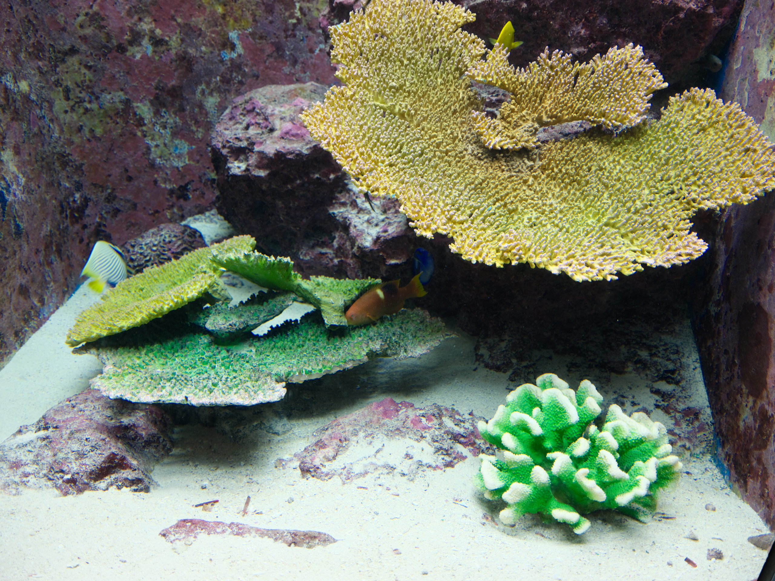 非常に美しい珊瑚礁の海中が再現されている。その上を黄色、オレンジ、青色など、カラフルな魚が泳いでいる。