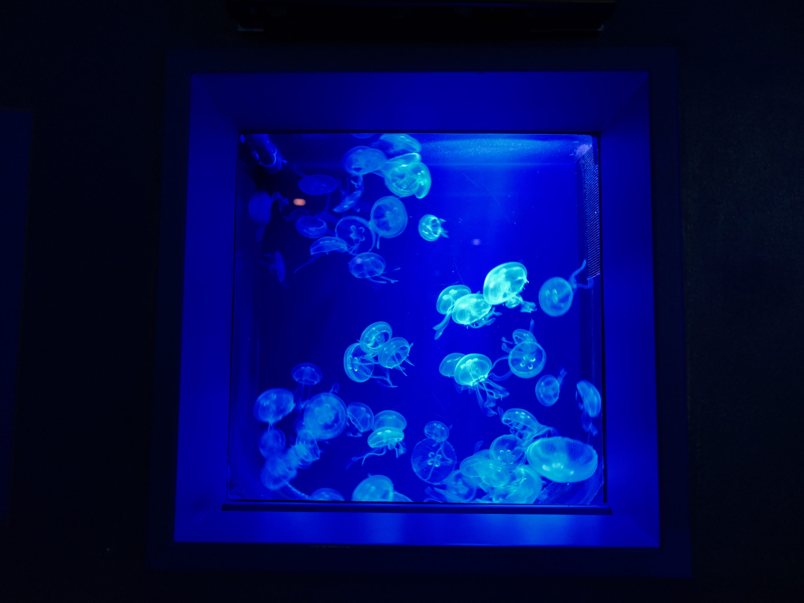 神秘的。まるで信号のように虹色に発光するくらげもいる。