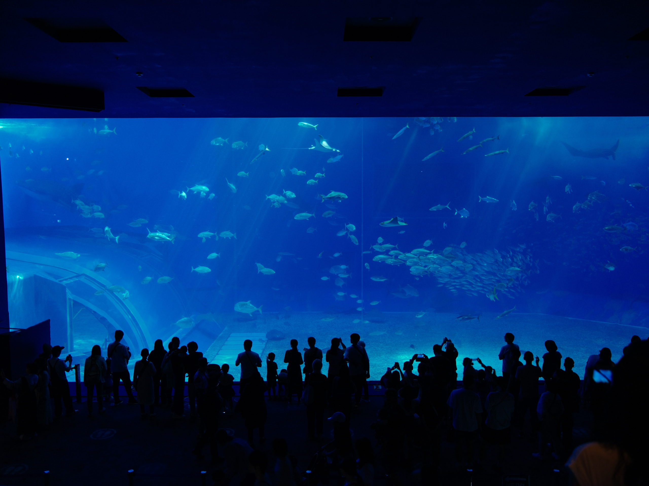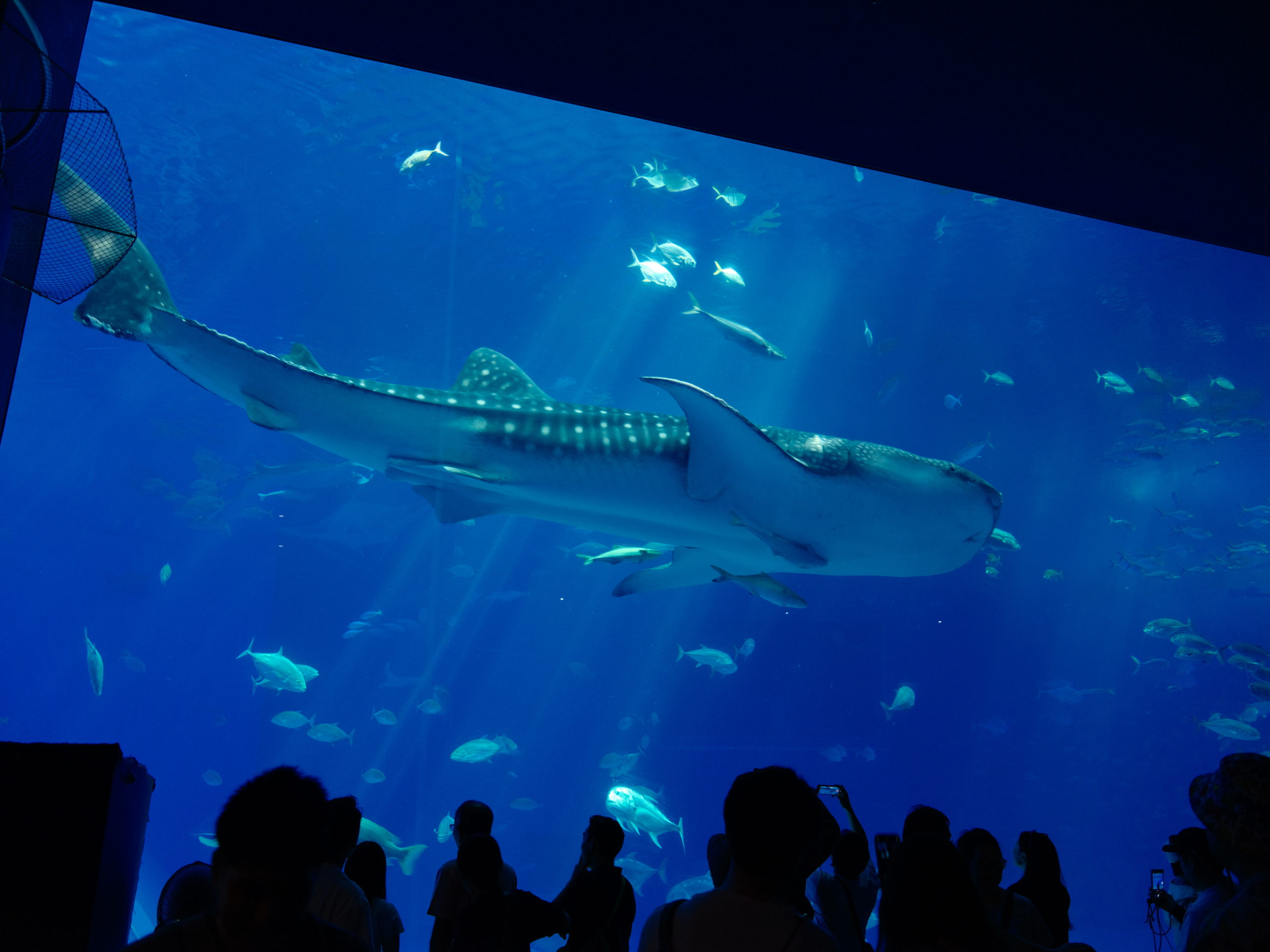 通路が分離して1Fと2Fに分かれる。この水槽は2階だて相当の高さがあるわけだ。水槽を眺めていると、お待ちかねの巨大ジンベイザメが泳いできた。これが水族館入口にあるサメのモニュメントとなっている。水槽を左から右へと泳いでいく。水槽内の手前を泳いでいくため、迫力満点だ。何メートルもある巨大な体が目の前を通り過ぎていく。すぐにまた周回して戻ってくるため、何度でもお目にかかれる。